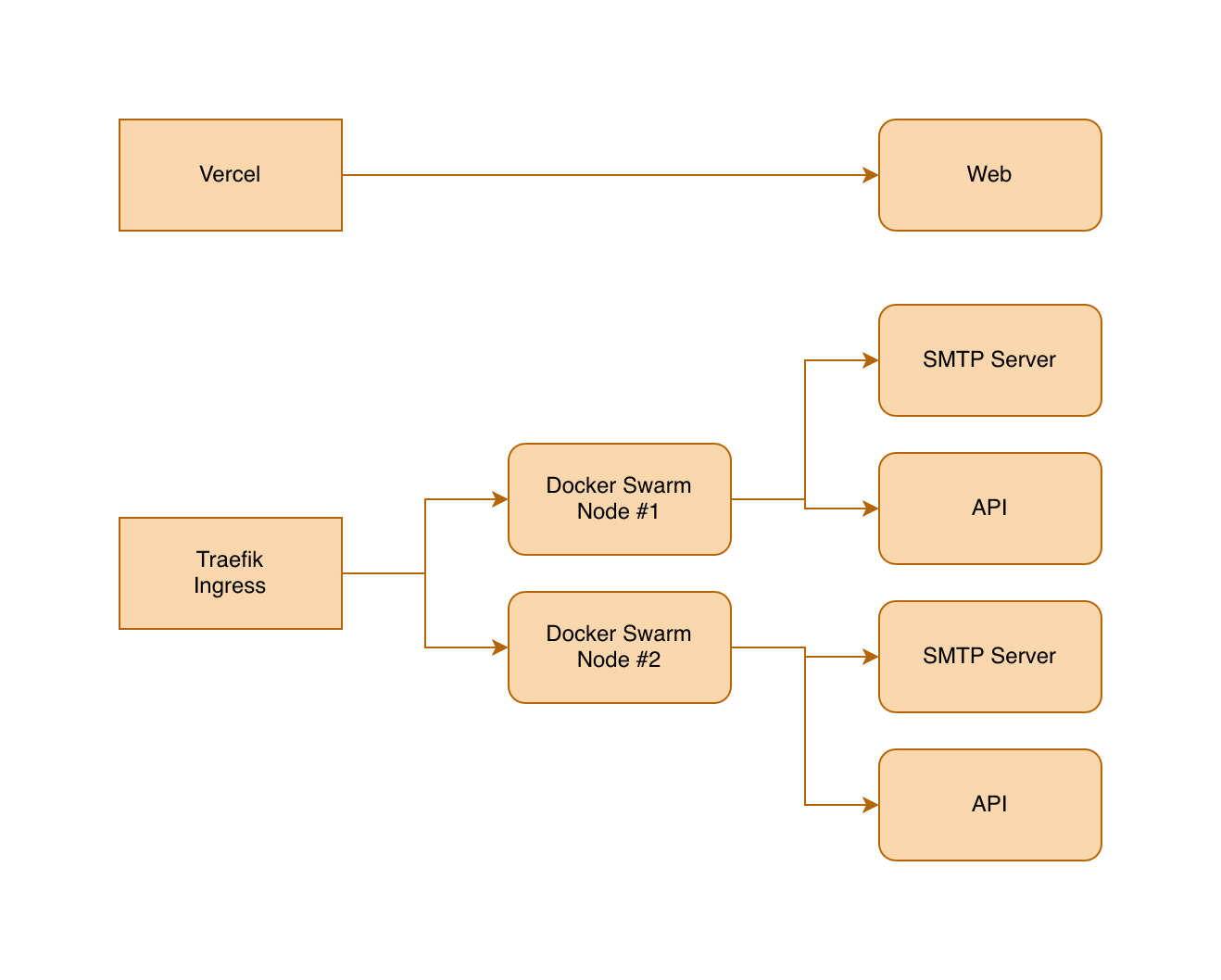 API server, separate from SMTP. This is a deliberate load isolation choice. API request spikes can’t affect SMTP ingestion. The SMTP server’s ability to accept emails is the highest priority in the system. Everything else can queue or degrade gracefully.